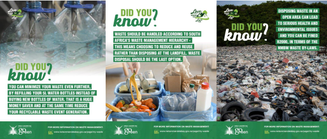 Separation at source must be implemented in line with the Municipality’s Integrated Waste Management Plan and Waste By-laws to mitigate against increasing waste generation, landfill airspace depletion, environmental degradation and pollution as a result of illegal dumping, littering etc.